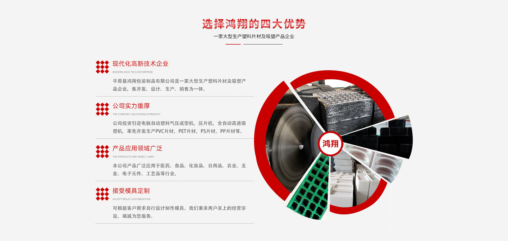 平原縣鴻翔包裝制品有限公司是一家大型生產(chǎn)塑料片材及吸塑產(chǎn)品企業(yè),本公司投資引進(jìn)電腦自動(dòng)塑料氣壓成型機(jī),壓片機(jī),全自動(dòng)高速吸塑機(jī),率先開(kāi)發(fā)生產(chǎn)PVC片材,PET片材,PS片材,PP片材等,鴻翔是國(guó)內(nèi)先進(jìn)的生產(chǎn)廠家之一。本公司產(chǎn)品廣泛應(yīng)用于醫(yī)藥、食品、化妝品、日用品、農(nóng)業(yè)、五金、電子元件、工藝品等行業(yè),也可根據(jù)客戶需求自行設(shè)計(jì)制作模具。本公司技術(shù)力量雄厚,生產(chǎn)設(shè)備工藝先進(jìn)。我們秉承用戶至上的經(jīng)營(yíng)宗旨,竭誠(chéng)為您服務(wù)。
